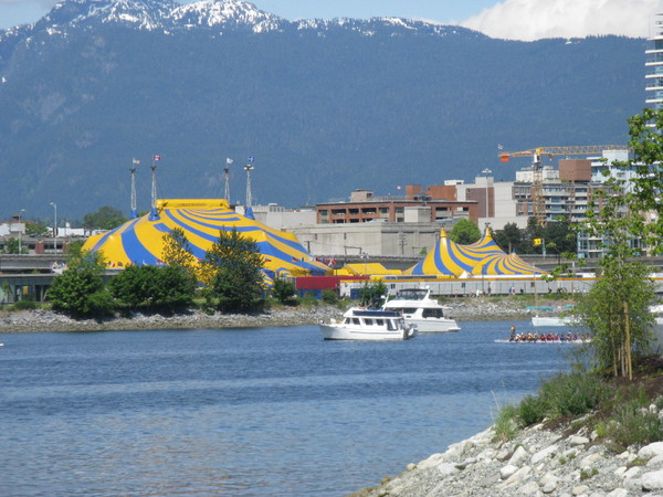 哈哈,拖了快一個月後,【單車日記】晴空萬里 探路篇 - 上終於有下集啦。話說我們騎了近一個小時後終於到了 False Creek 附近,每年夏天都會來這表演的Cirque du Soleil, 今年也不例外的在 Science World 旁搭起帳篷表演Corteo, 裝飾了藍天讓天空更鮮艷。
